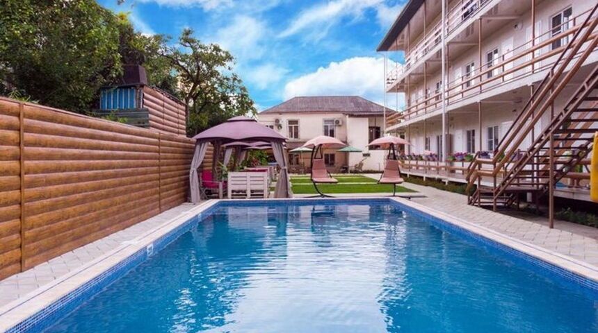 Отель находится в Сухуме, в районе Турбазы. Расстояние от моря примерно 700 метров (7-10 минут пешком), пляж песчано-галечный. На побережье имеются шезлонги, навесы от солнца, зонтики. За 5 минут можно доехать до центра города и главных достопримечательностей абхазской столицы – ботанического сада, театра имени Чанба, обезьяньего питомника. В шаговой доступности – магазины, кафе с абхазской кухней и рынок. Отель имеет огороженную и охраняемую территорию, красивый и чистый БАССЕЙН с детской зоной и подогревом, рядом зона отдыха с беседками. В отеле можно поиграть в бадминтон, установлен теннисный стол, дартс, есть кальян. Есть мангальная зона, бесплатно. Для удобства отдыхающих организована кухня-столовая, где гости могут самостоятельно приготовить еду, а так же есть недорогое кафе, можно заказывать питание. Для детей по вечерам включают мультфильмы на большом экране.