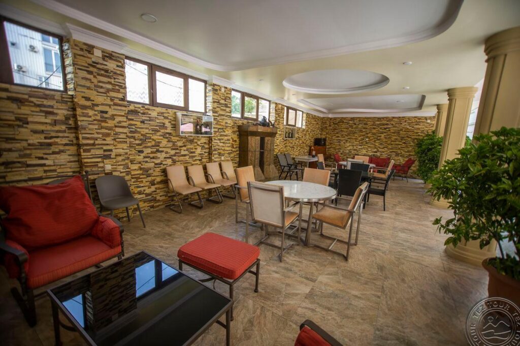 - Для комфортабельного отдыха территория отеля оснащена: бассейном с мелководной зоной для детей, живописным садом с водопадом, детской игровой зоной и кафе, где можно насладиться настоящей грузинской кухней