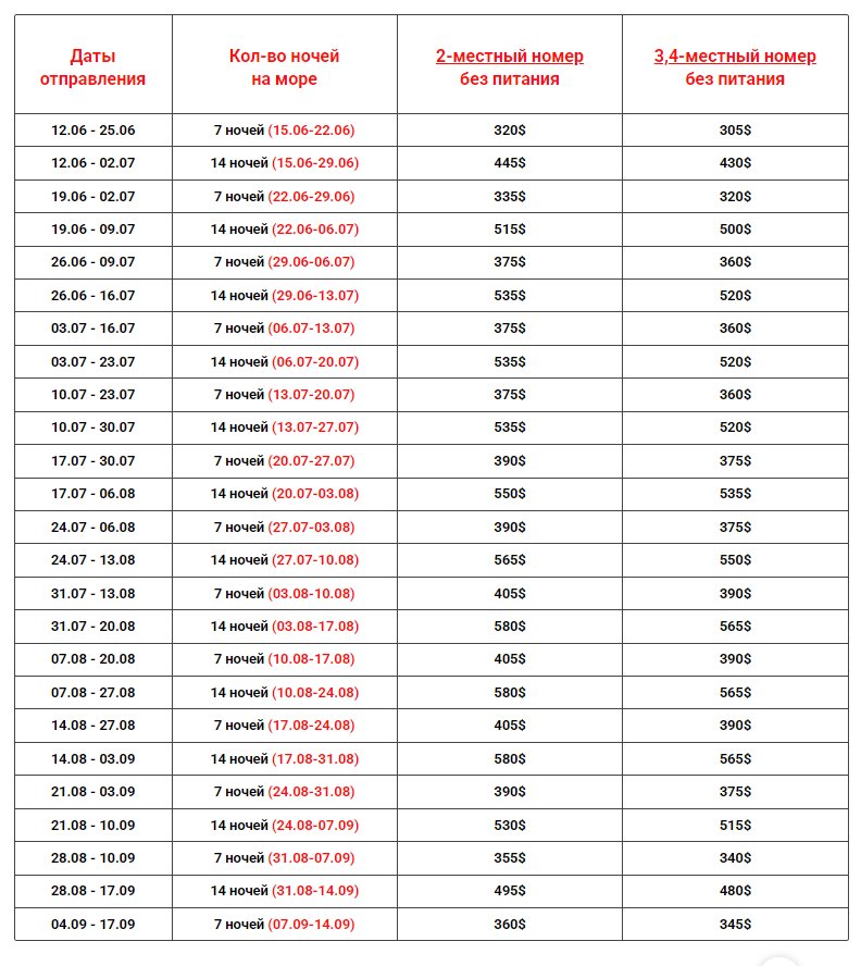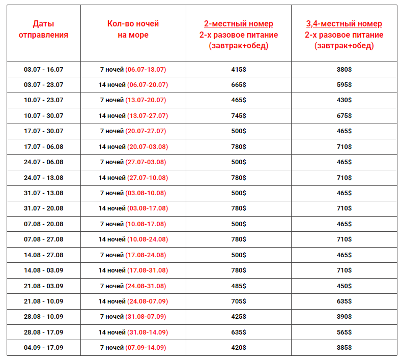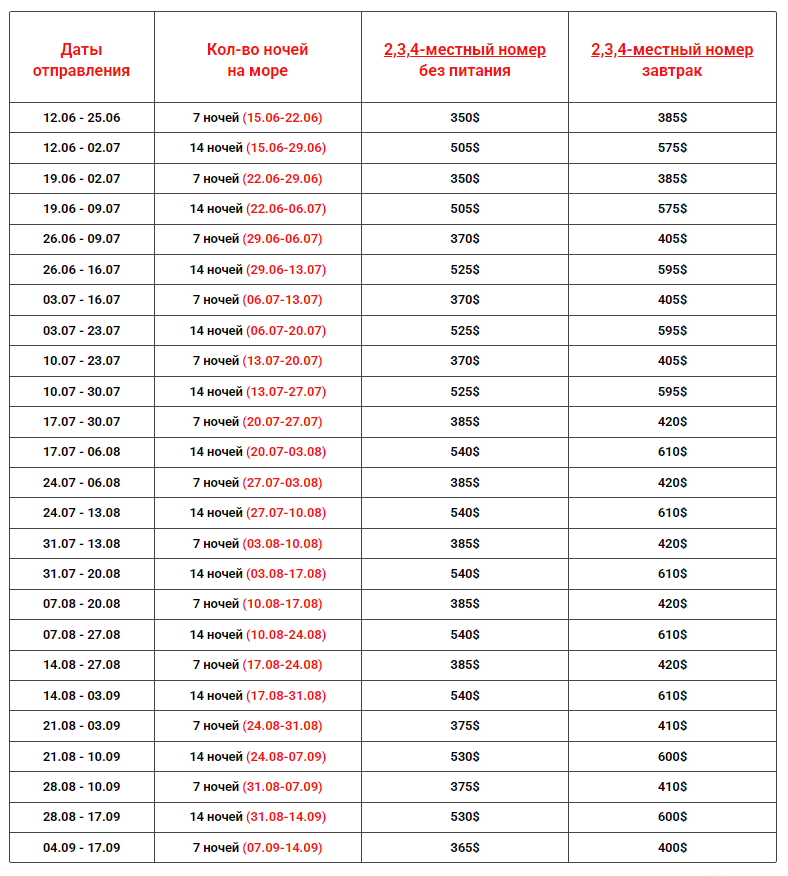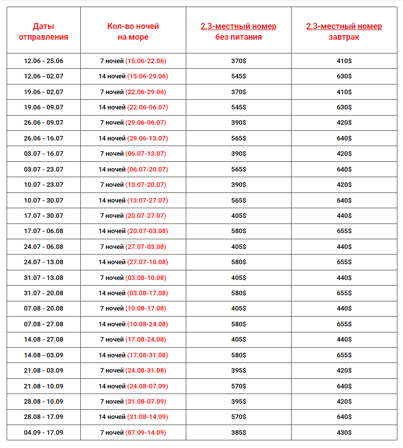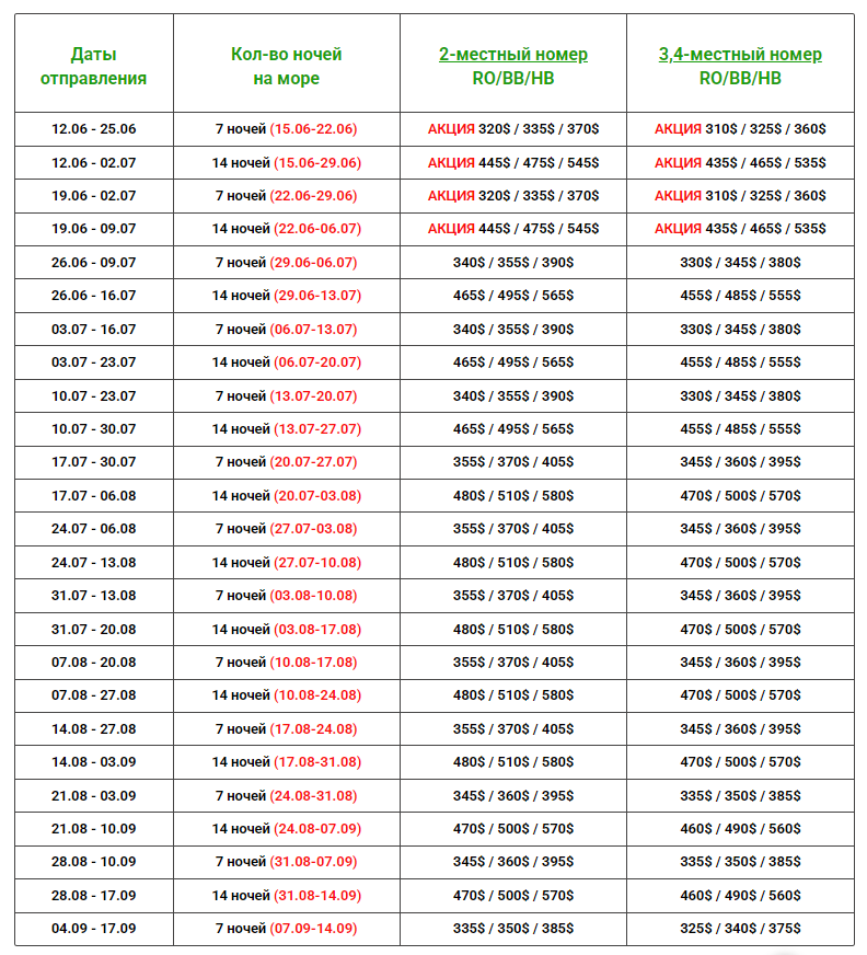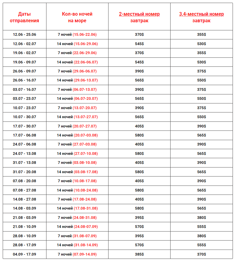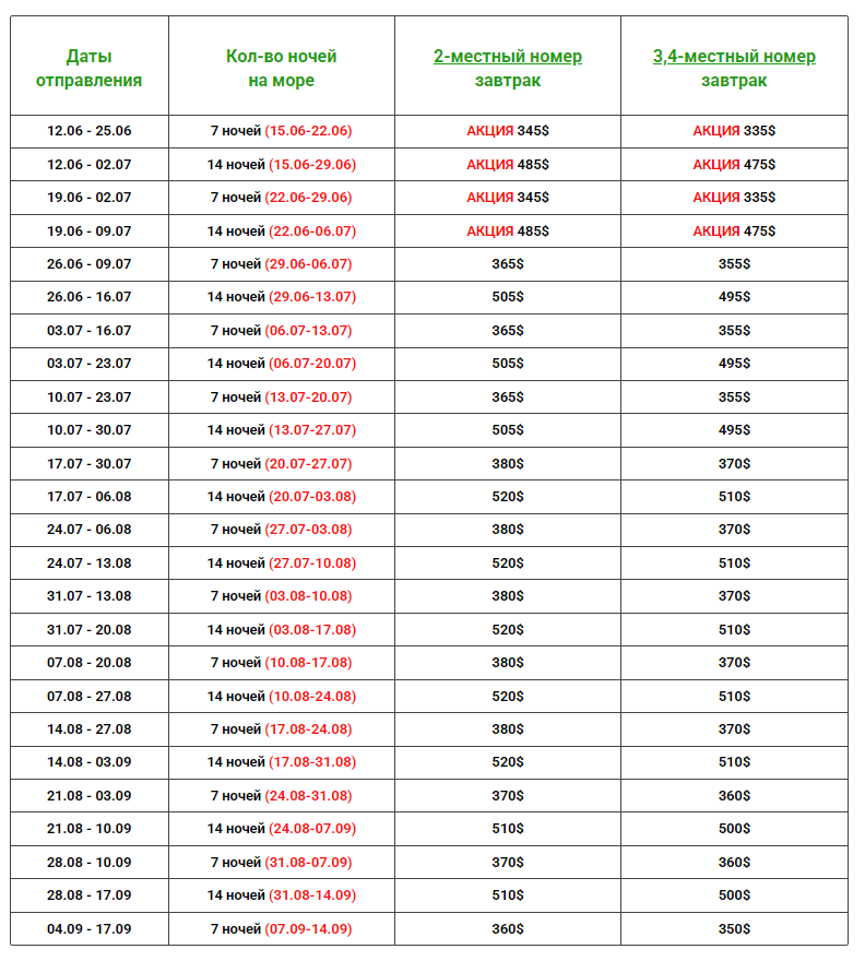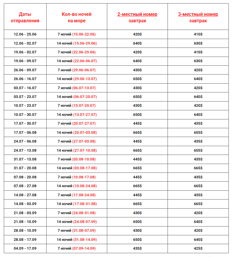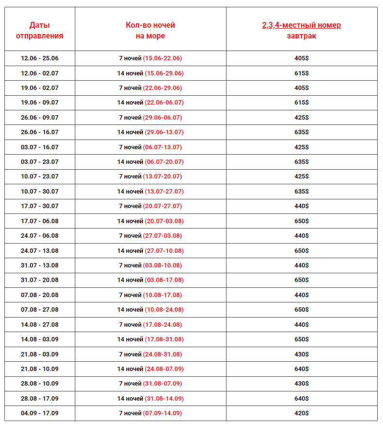 Даты выездов и цены: