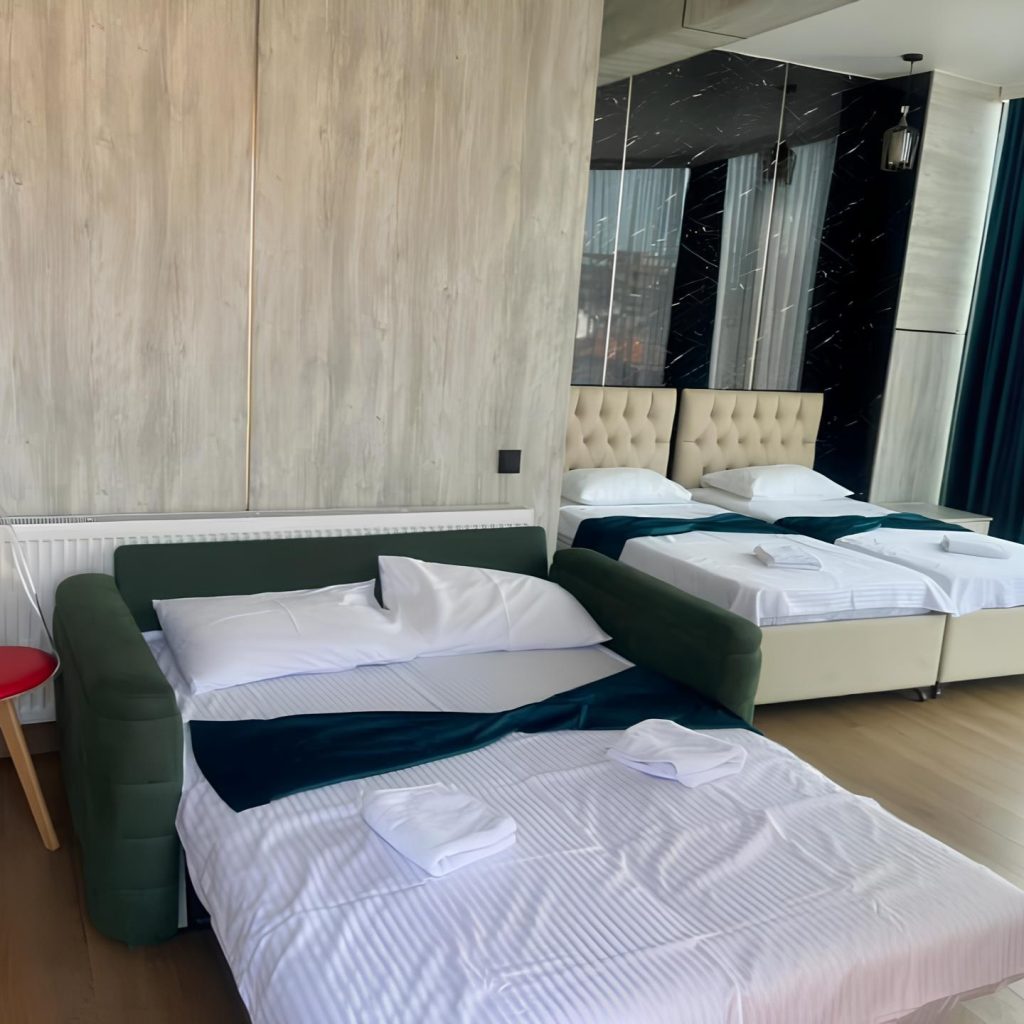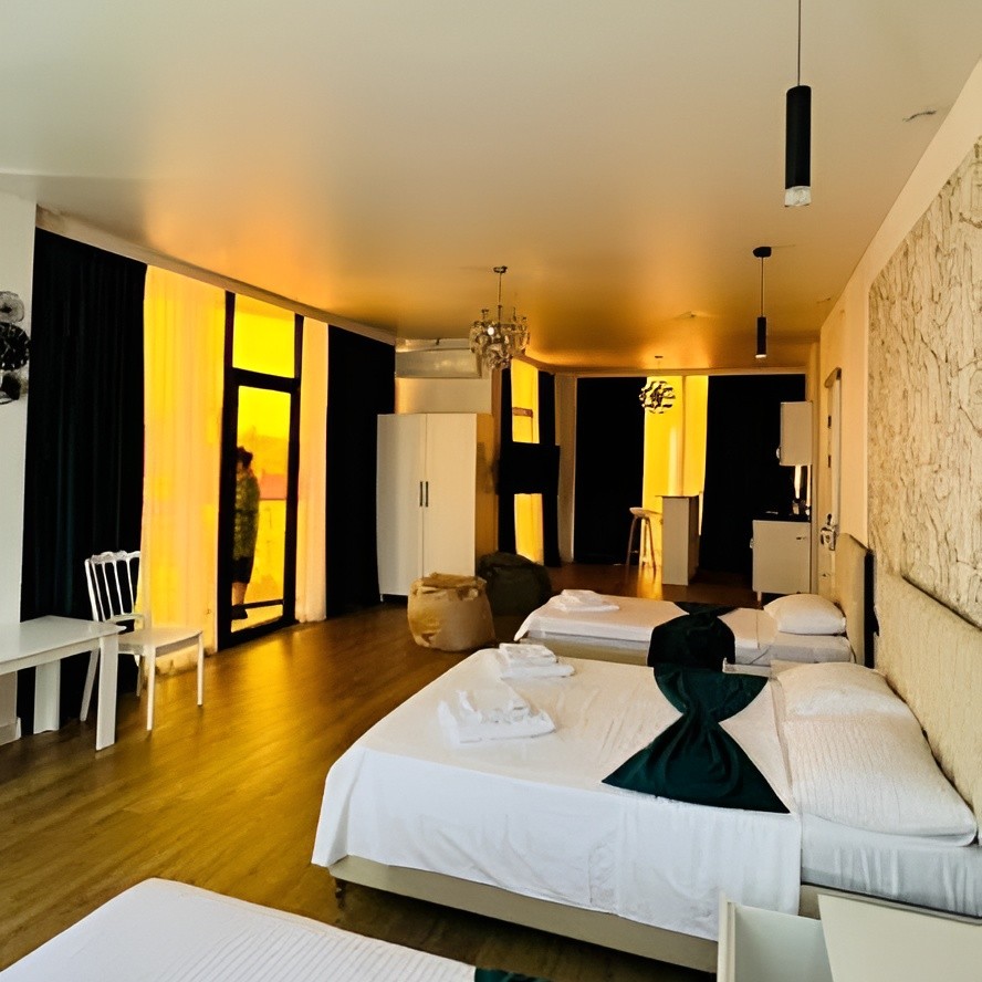 Отель состоит из двух 4-х этажных корпусов, один из которых построен в 2024 году, другой частично реновирован. Расположен в центре Кобулети, в 350 м от пляжа. КОРПУС № 1 — Номера – 2-х 3-х, 4-х местные с отдельными кроватями , душ, туалет, ТВ, холодильник, кондиционер . На каждом этаже также есть миникухня . Особенностью номеров в этом миниотеле то, что все стены некоторых номеров отделаны настоящей натуральной сосной, что дает возможность насладиться не только морским воздухом, но и получить полное ощущение нахождения в сосновой роще.