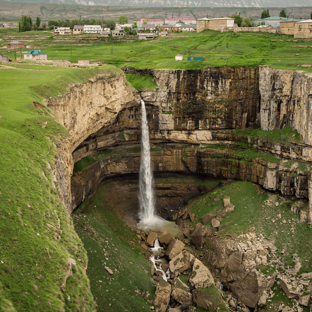 Водопад Тобот высотой в 70 метров — главное украшение Хунзахского плато, откуда открывается прекрасный вид на каньон Цолотль и ниспадающие в него реки.