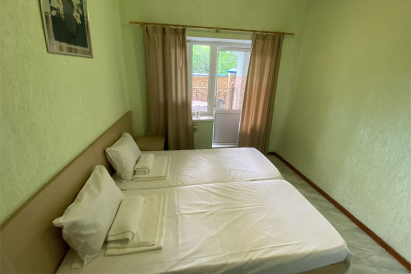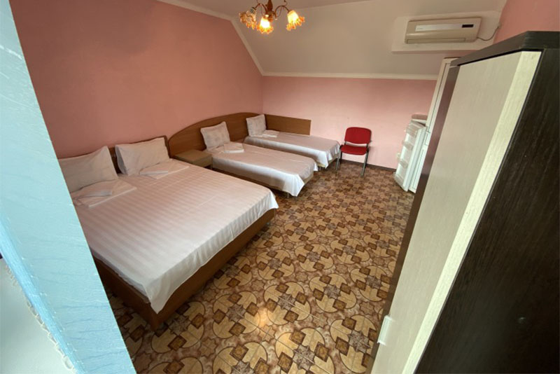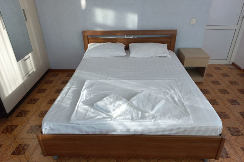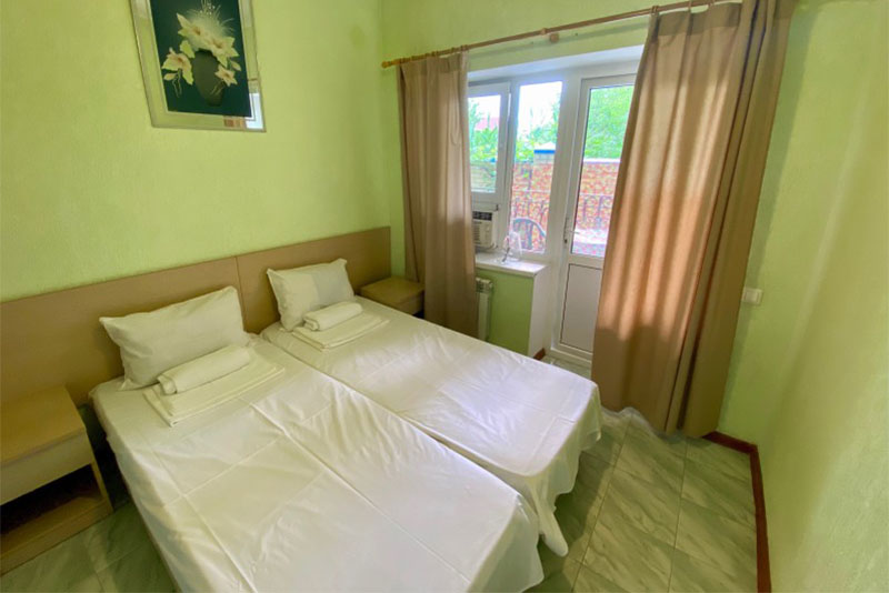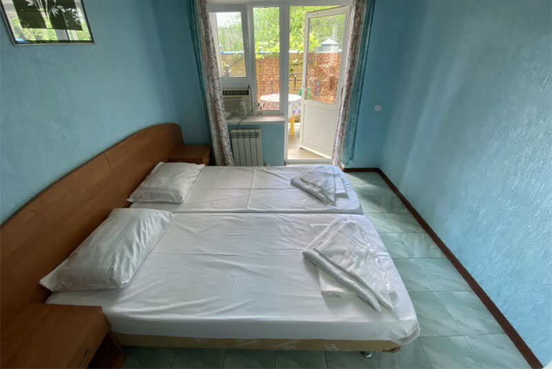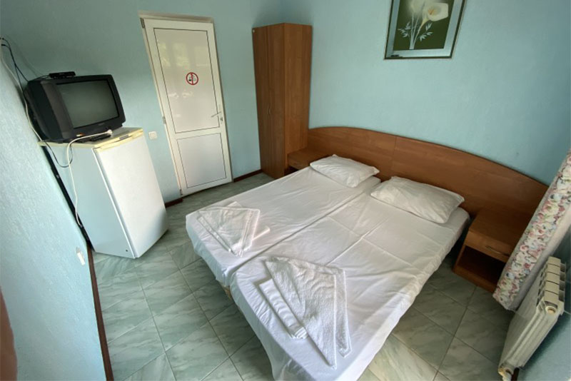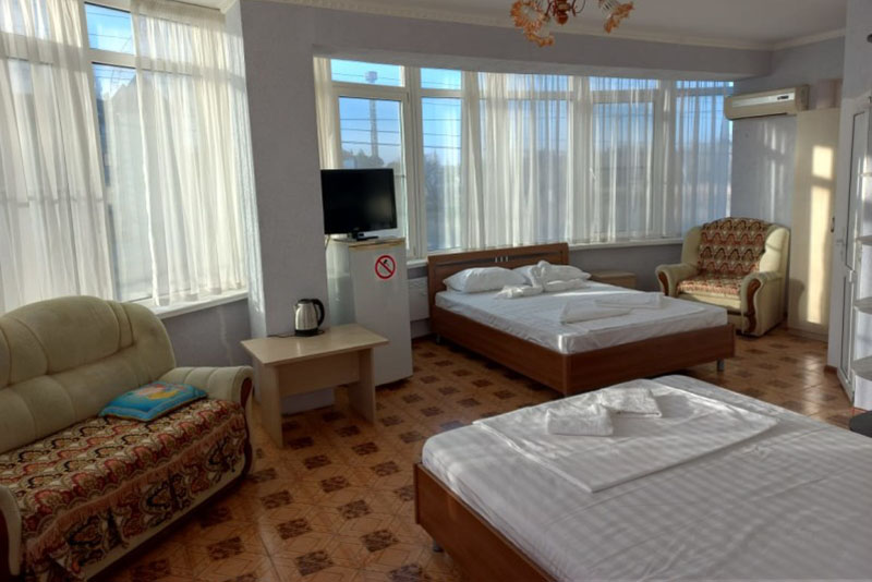 Размещение: 2-х местные стандартные и 3-х, 4-х местные улучшенные номера. В номерах современная мебель, вместительный шкаф, телевизор, холодильник, Wi-Fi, санузел. Комнаты кондиционированы. Смена белья проводится 1 раз в 7 дней. На террасе установлена пластиковая мебель.