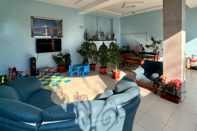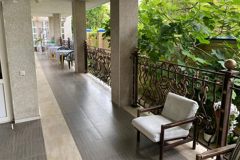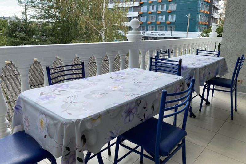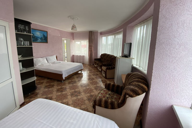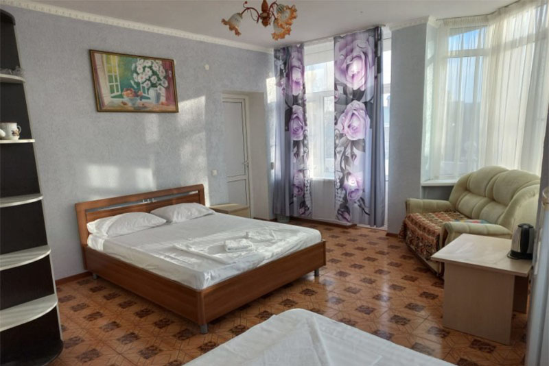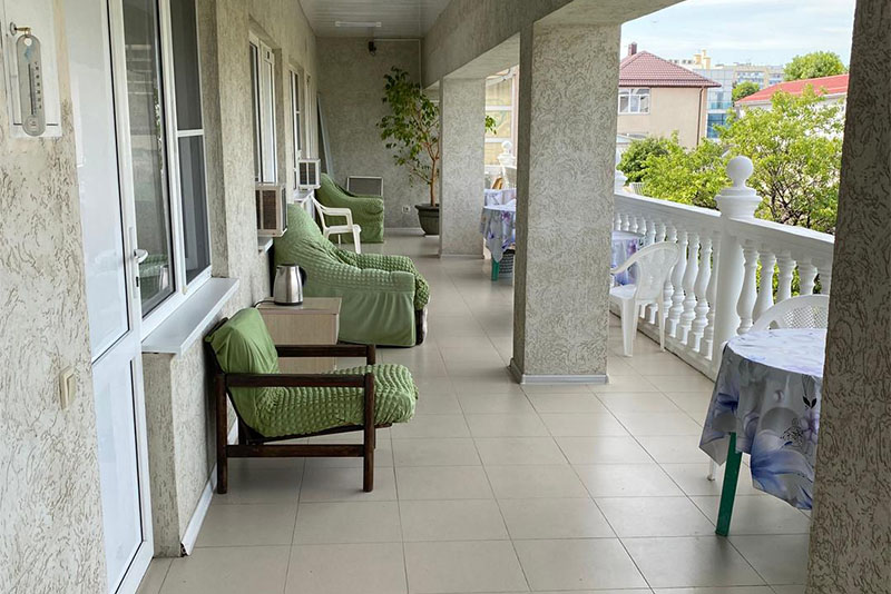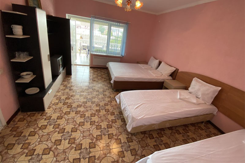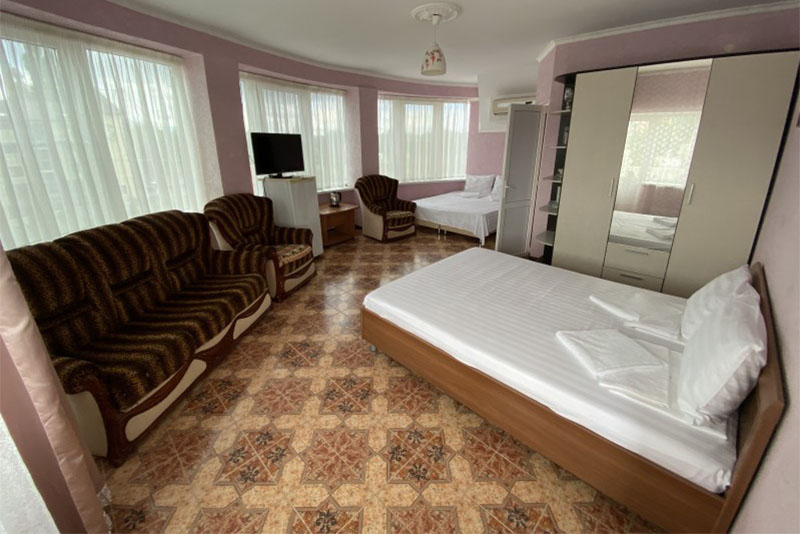 Размещение: 2-х местные стандартные и 3-х, 4-х местные улучшенные номера. В номерах современная мебель, вместительный шкаф, телевизор, холодильник, Wi-Fi, санузел. Комнаты кондиционированы. Смена белья проводится 1 раз в 7 дней. На террасе установлена пластиковая мебель.