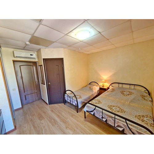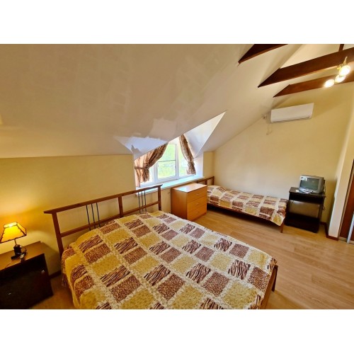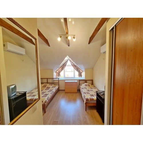 2 и 3-х местные номера со всеми удобствами на третьем этаже (мансардный этаж): просторная комната, шкаф для одежды, односпальные или двухспальная кровать с ортопедическим матрацем, необходимая мебель, сейф, сплит-система, телевизор, холодильник на этаже на 3 номера, санузел с душевой кабиной, фен. Дополнительное место не предусмотрено.