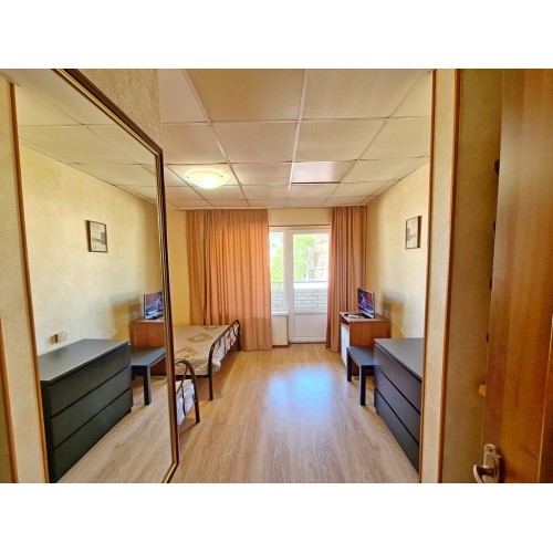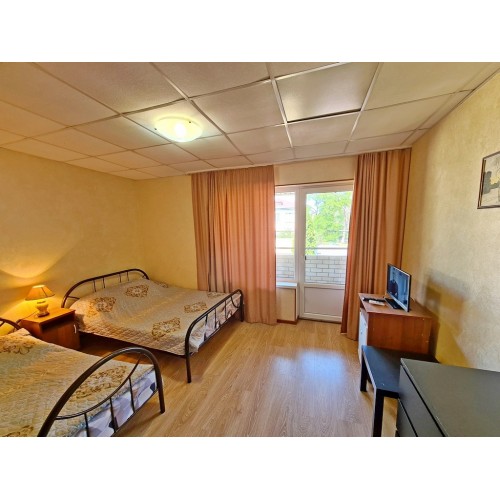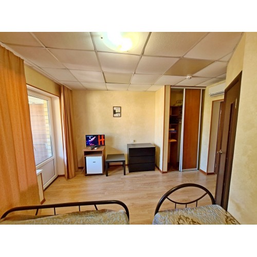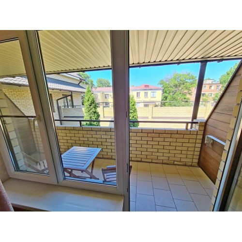 2 и 3-х местные номера со всеми удобствами на втором этаже с БАЛКОНОМ: просторная комната, гардеробная с полками для одежды, односпальные или двухспальная кровать с ортопедическим матрацем, необходимая мебель, сейф, сплит-система, телевизор, холодильник, санузел с душевой кабиной, фен. На балконе стол, стулья, сушилка для белья. Дополнительное место не предусмотрено.