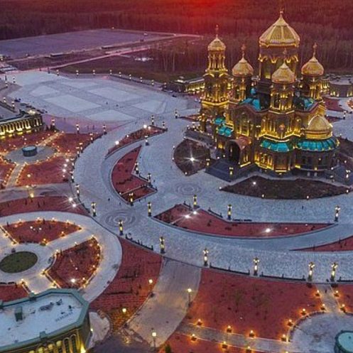 Посещение главного храма ВС РФ. На площади около храма развернуты полевые кухни, где посетителей ждут настоящая армейская каша, блины и другие угощения.