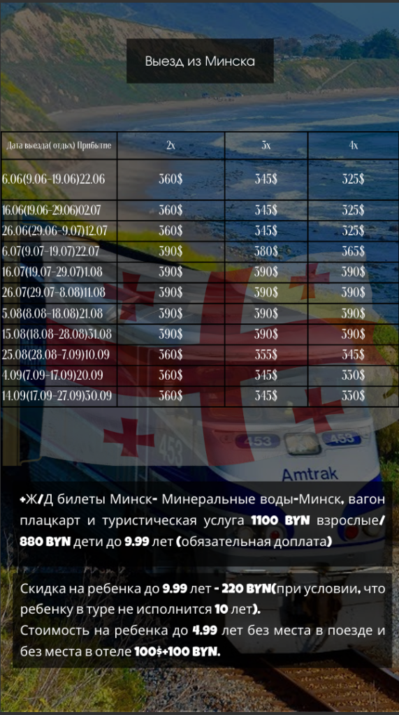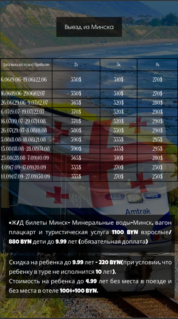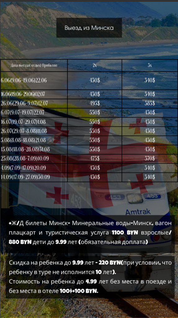Стоимость на ребенка до 4.99 лет без места в поезде и без места в отеле 100$+100 BYN.