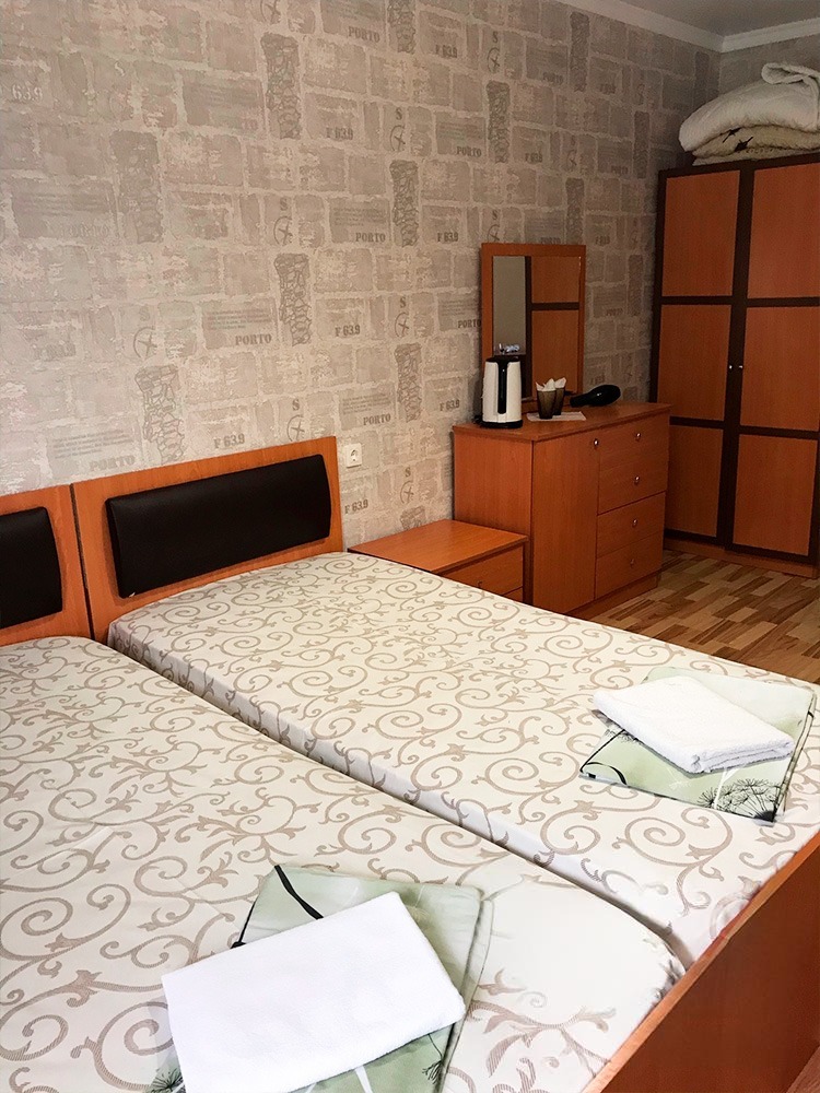 ПРОЖИВАНИЕ: В номере эконом размещение от 2-4 человек.В эконом номере душ и туалет находиться на этаже.В 2-х,4-х местных номерах класса стандарт все удобства в номере. Все номера оборудованы телевизором, есть интернет, холодильником, кондиционером, удобствами (душ, туалет, раковина), и многим другим что так необходимо для комфортного отдыха.